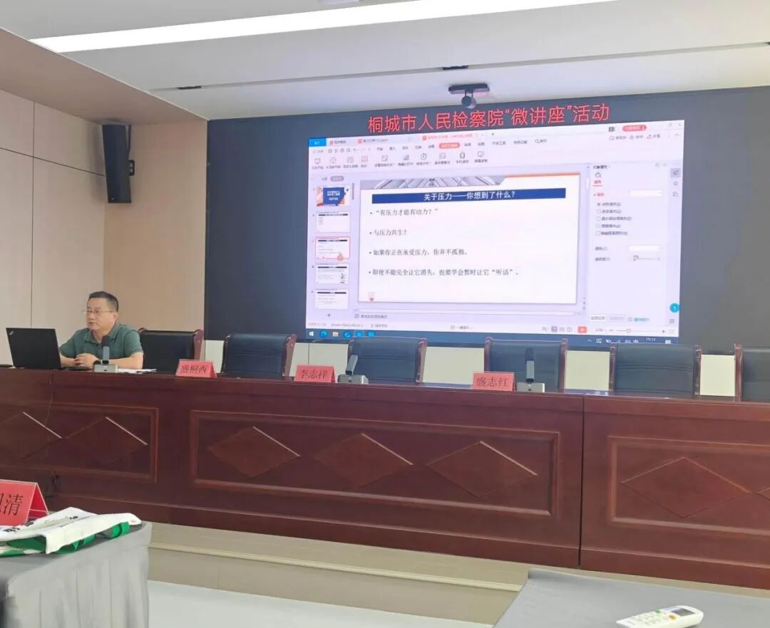 活动期间,精神卫生中心主任盛桐西与市疾控中心主任盛志红一起,到桐城市人民检察院,为全体干警作心理健康知识专题讲座。盛桐西主任紧密结合检察工作实际,深入分析当前检察人员面临的职场压力来源,从心理学视角系统解读压力的形成机制与应对原理,并提供多种行之有效的压力调适方法。讲座现场全体干警认真聆听,深入思考,加深了对各种心理现象的理解和认识。讲座结束后,与会干警普遍反映,讲座内容务实管用,有助于提升自我心理调适能力。