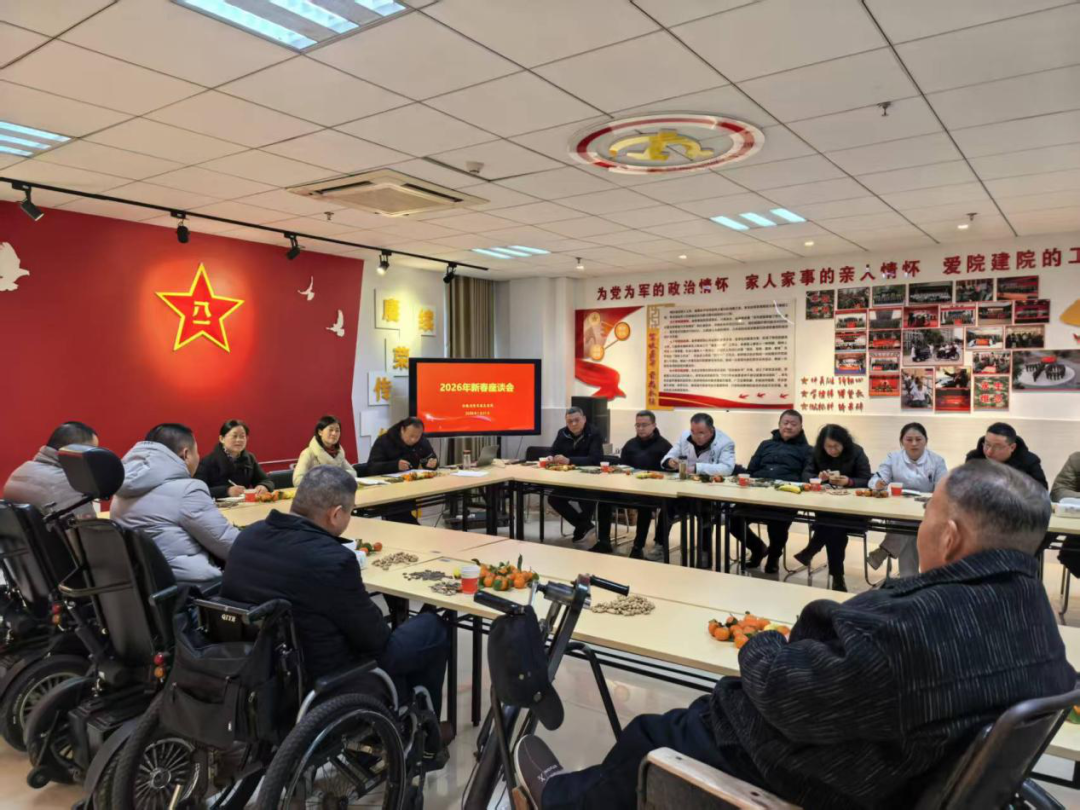 瑞雪迎新春,温情暖荣军。为进一步加强医院与在院休养员之间的沟通交流,精准倾听心声、凝聚发展共识,持续提升优抚服务保障质效,1月21日,医院组织召开在院休养员2026年新春座谈会。院领导班子成员、在院休养员及各职能科室负责人齐聚一堂,面对面交流、心贴心沟通,共叙情谊、共谋发展。